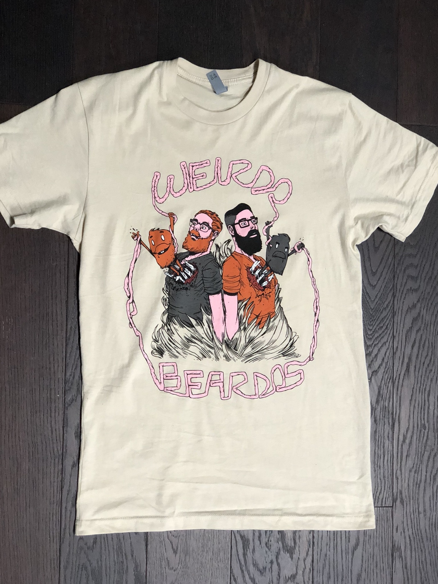 Gore, viscera, and beards! The first ever shirt from the Internet’s Worst Webcomic, Weirdo Beardos. Featuring the comic’s creators (and former protagonists) with their respective beard buddies bursting forth from their chests, like some form of alien... or something.